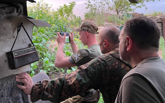 Лидер "РОДИНЫ" посетил передовые позиции интернациональной бригады "Пятнашка", где в тот момент шла корректировка огня при помощи поднятого в воздух беспилотника.