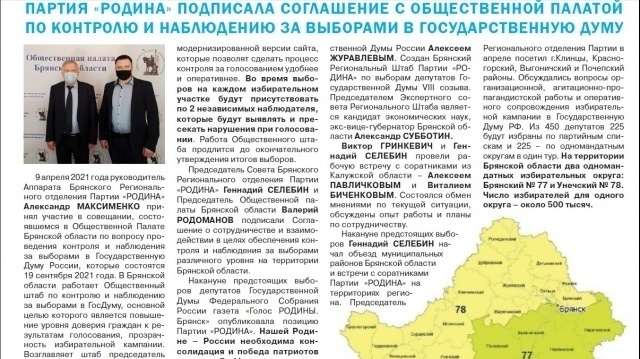 На второй полосе публикуются материал о подписании Брянской "РОДИНОЙ" Соглашения с Общественной палатой Брянской области по контролю и наблюдению за выборами в Государственную Думу России.