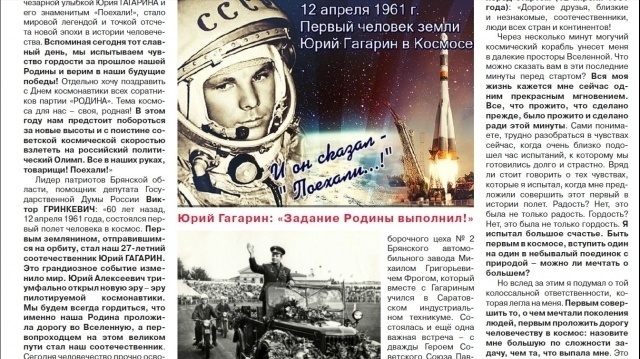 Лидер патриотов Брянской области, помощник депутата Государственной Думы России Виктор Гринкевич: "Первым землянином, отправившимся на орбиту, стал наш 27-летний соотечественник Юрий Гагарин. Это грандиозное событие изменило мир. Юрий Алексеевич триумфально открыл новую эру - эру пилотируемой космонавтики. Мы будем всегда гордиться, что именно наша Родина проложила дорогу во Вселенную, а первопроходцем на этом великом пути стал наш соотечественник. Сегодня человечество прочно освоило околоземную орбиту, создало крупнейшую станцию и готовится к покорению планет. Отечественная космонавтика выросла на кораблях "Восток", окрепла на "Союзах", а корабли "Орел" помогут освоить дорогу в дальний космос".