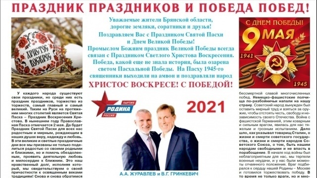 Накануне Праздника Православной Пасхи и Дня Победы 10-тысячным тиражом вышел апрельский выпуск газеты "Голос РОДИНЫ. Брянск" (электронная версия газеты: "Голос РОДИНЫ. Брянск").