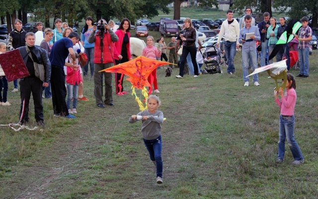 В фестивале принимали участие несколько команд. Взрослые и дети соревновались, у кого выше взлетит змей.