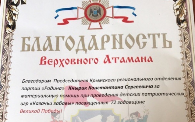 Руководитель регионального отделения партии "РОДИНА" в Республике Крым Константин Кнырик получил благодарность от верховного атамана за материальную помощь при проведении детских патриотических игр "Казачьи забавы", посвященных 72-й годовщине победы в Великой Отечественной войне.