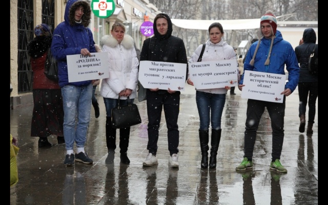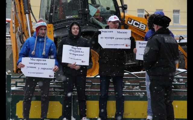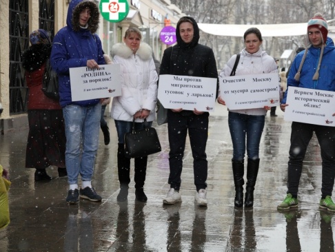 Активисты держали в руках плакаты с лозунгами: "Очистим Москву от мусора самостроя!", "Партия "РОДИНА" за порядок!» и хештегами: "#по-хозяйски", "#самостройотстой", "#самостроюнет".