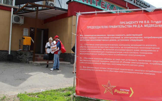 Активисты нижегородского отделения партии "РОДИНА" вышли на улицы Нижнего Новгорода с одиночными пикетами. Цель акции – проведение социологического опроса и сбор подписей за отмену существующей системы расчёта платы за электроэнергию, расходуемую на общедомовые нужды в многоквартирных домах.