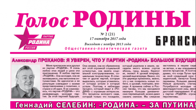 Газета "Голос РОДИНЫ. Брянск" распространяется в Брянске и в районах области через местные отделения партии "РОДИНА". Читайте новый выпуск газеты брянской "РОДИНЫ" здесь Голос "РОДИНЫ" №2(21).