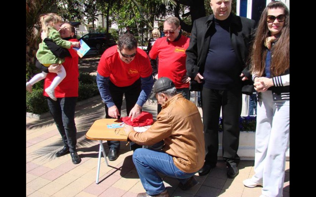 Сочинцы провели акцию "Нерушимый Союз" на площади у кинотеатра "Родина". Всем, подписавшим поздравительные открытки вручались футболки с символикой партии "РОДИНА".
