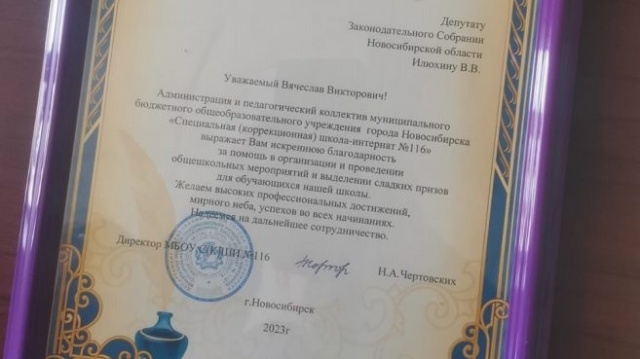 В знак признательности коллектив школы-интерната передал Вячеславу Илюхину благодарственное письмо за помощь, которую депутат оказывает при организации школьных мероприятий.