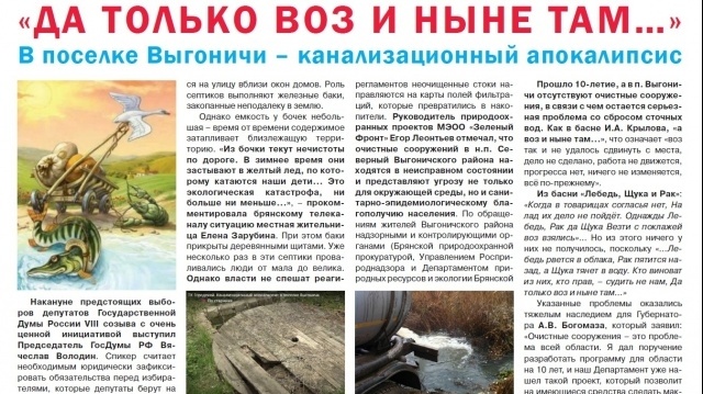 На четвертой полосе газеты публикуется статья о проблемах водоотведения в п. Выгоничи Брянской области.